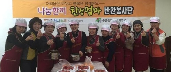 이 봉사단은 독거 어르신 등을 대상으로 평소 부족한 영양소를 골고루 섭취할 수 있도록 제육볶음과 건새우조림, 햇김치 등을 만들어 전달했다. 이 봉사단은 ‘어려움은 나누고 행복은 함께 해요’라는 슬로건을 내걸고 나눔과 희망이 넘치는 수송동을 만들기 위해 부녀회(회장 이정순)을 중심으로 운영되고 있으며, 매월 양질의 반찬을 정성껏 만들어 어려운 가정에 전달하고 있다.