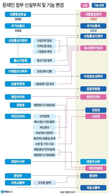 구체적으로는 중소기업청, 국민안전처, 행정자치부, 대통령 경호실이 폐지되고, 중소벤처기업부, 통상교섭본부, 소방청, 해양경찰청, 행정안전부, 대통령 경호처가 설치된다.