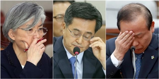 ▲ 7일 국회에서 열린 강경화 외교부 장관 후보자, 김동연 부총리 겸 기획재정부 장관 후보자, 김이수 헌법재판소장 후보자(왼쪽부터)에 대한 인사청문회에서 여야 위원들의 질문에 각 후보들이 힘든 표정을 짓고 있다. ·연합뉴스