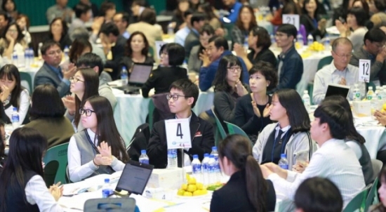 ▲ 완주교육지원청과 완주군은 지난해 10월 14일 완주문화체육회관에서 학생과 교사 학부모 주민들이 참여한 ‘완주 로컬에듀 300인 원탁토론회’를 열고 지역교육의 방향성을 논의했다. 사진제공=완주교육지원청