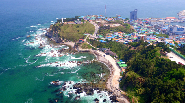 ▲ 울진군 죽변면 하트 해변은 파도의 자연 침식작용에 의해 형성된 하트 문양으로 젊은 연인들에게 데이트 명소로 불린다. 해변 꼭대기에 있는 ‘폭풍 속으로’ 드라마 세트장도 둘러볼 만한 곳이다. 사진 제공=경북 울진군