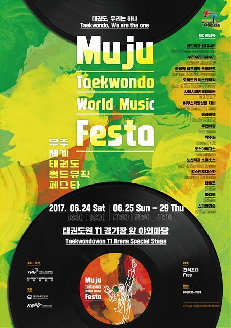 태권도진흥재단(이사장 김성태)과 2017무주WTF세계태권도선수권대회조직위원회(공동위원장 송하진·이연택)가 함께 기획하는 ‘우리는 하나, 무주 태권도 월드뮤직 페스타’ 공연이 2017 무주 WTF 세계태권도선수권대회 기간 중에 태권도원에서 열린다.