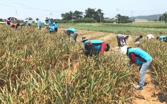 ▲ 한국농어촌공사 정읍지사는 지난 9일 20여명의 직원이 참여한 가운데 정읍시 소성면 대성마을 유영백씨의 밭에서 마늘캐기 농촌일손돕기를 실시했다.