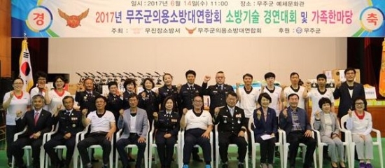 ▲ 14일 열린 무주 의용소방대 소방기술경연대회에서 참석자들이 기념촬영을 하고 있다.
