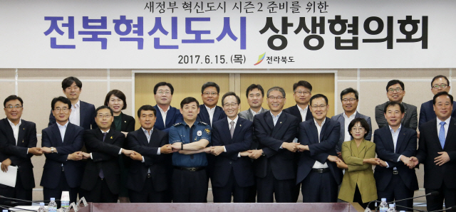 전북도는 15일 종합상황실에서 송하진 지사 주재로 ‘혁신도시 상생협의회’를 열었다. 이날 회의에는 혁신도시 공공기관 간부와 전북도 실국장들이 참석해 문재인 정부의 혁신도시 시즌2를 뒷받침할 지역 현안사업을 논의했다.