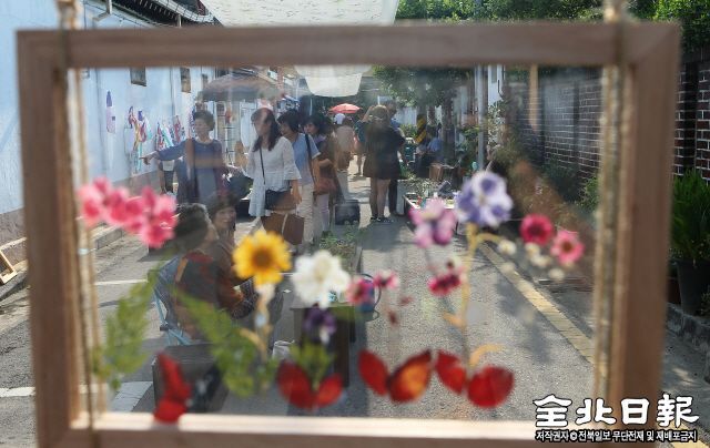 ▲ 지난 17일 전주시 중노송동 문화 1길에서 마을주민들이 꽃과 인생이 어우러진 삶의 이야기를 나누는 ‘꽃장’이 열린 가운데 압화 액자 뒤로 주민들이 꽃과 관련된 제품들을 판매하며 이야기 꽃을 피우고 있다. 박형민 기자