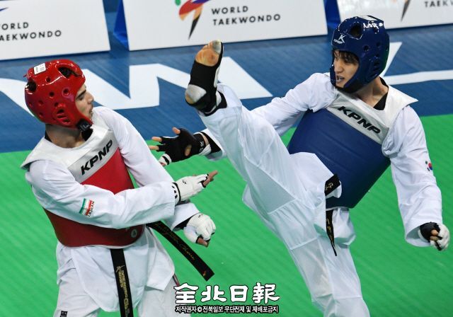 26일 무주 태권도원 T1경기장에서 열린 2017 WTF 세계태권도선수권대회 사흘째 남자 -68kg급 8강에 출전한 한국 이대훈 선수가 이란 선수에게 힘찬 발차기 공격을 하고 있다.