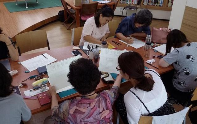 사람들이 긴 테이블 위에 오밀조밀 앉아 휴대폰 화면에 있는 그림을 도화지에 옮겨 그린다. 휴대폰 화면에는 정겨운 마을시장 풍경이 담겨 있다. 30대부터 60대 어르신까지 세대도 다양하게 섞여있다. 그렇게 그림을 한참 그리다 서로 눈이 마주치면 수다 삼매경에 빠진다. 일상에서 겪었던 이야기부터, 지금 그리고 있는 그림에 대한 이야기, 어떤 예술가에 대한 평가까지 수다의 주제는 다채롭다. 무슨 활동인지 물으니 지난 시간 동네 시장을 돌아다니며 자기 마음에 남았던 사진을 골라 본인이 바라본 시선으로 그려나가는 과정이라고 설명했다.