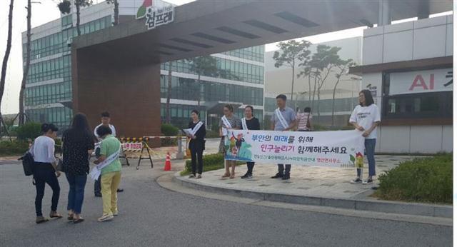 28일 부안군 행안면에 위치한 제2농공단지 내 대규모 닭고기 전문업체인 참프레 직원들을 대상으로 부안인구 늘리기 캠페인이 전개됐다.