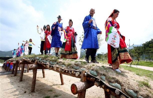 ▲ 무주 WTF 세계태권도선수권대회 선수들이 한복을 입고 섶다리를 건너고 있다.
