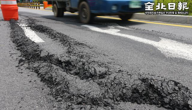 전북본부 현장 관계자는 “아스팔트가 표면에 부착이 잘 안 된 것으로 보인다”며 “기준치에 맞지 않는 재료가 들어갔을 수 있어 물리적 성질 시험과 성분 시험 등을 할 예정”이라고 밝혔다.