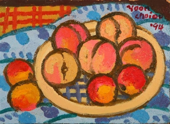 ▲ 윤재우 作(1917~2005), 자두와 복숭아, 캔버스에 유채, 24×33cm, 1994