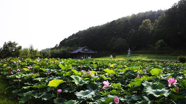 완주 비봉면 내월리에 있는 홍련암의 연꽃이 피기 시작해 관람객들의 발길이 이어지고 있다.