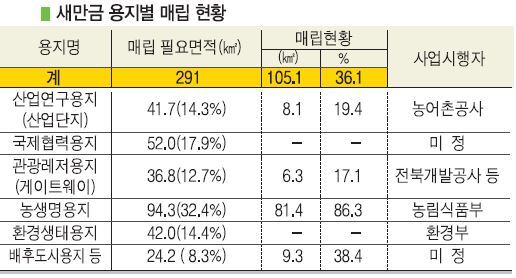 새만금 매립은 모두 6개 용지로 △산업연구용지(41.7㎢, 매립률 19.4%) △국제협력용지(52㎢, 매립률 0%) △관광레저용지(36.8㎢, 매립률 17.1%) △농생명용지(94.3㎢, 매립률 86.3%) △환경생태용지(42㎢, 매립률 0%) △배후도시용지(24.2㎢, 매립률 38.4%) 등으로 구성돼 있다.