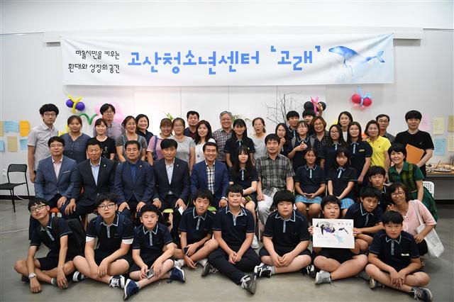 ▲ 지난 21일 고산청소년센터 ‘고래’ 개관식에서 지역청소년과 센터 관계자들이 기념사진을찍고 있다.