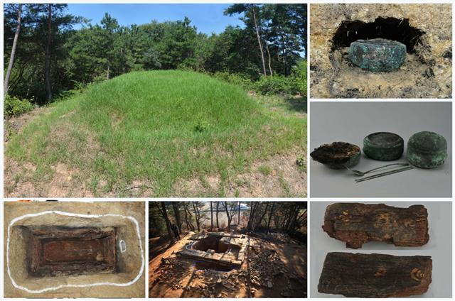 이 토광의 맨 아랫단에 길이 210㎝, 너비 85㎝의 나무 널(목관)과 나무 널을 보호하기 위한 나무덧널(목곽)이 2중의 관곽(棺槨, 시신을 넣는 속 널과 겉 널을 아울러 이르는 말) 형태로 확인됐다.