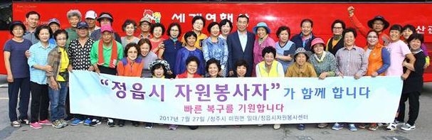 정읍시자원봉사센터(이사장 김영대)는 지난 27일 45명의 긴급 지원팀을 구성, 30여 가구가 집을 잃은 충북 청주시 미원면 일대에서 봉사활동을 펼쳤다. 이날 봉사자들은 폭우로 침수된 주택과 상가의 토사 제거및 오물과 진흙으로 뒤덮인 집안과 가재 도구 등을 말끔하게 청소하고 돗자리와 모기향 등 구호용품을 전달했다.