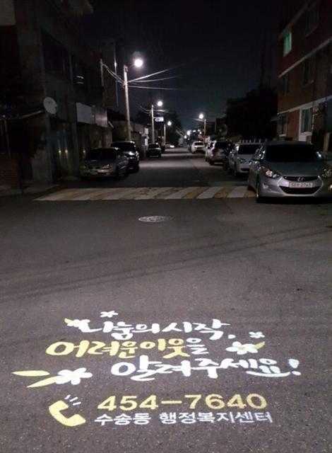 이 광고는 도로표면에 ‘나눔의 시작, 어려운 이웃을 알려주세요’라는 문구와 행정복지센터 외벽면에 ‘수송동은 당신을 사랑합니다, 힘겨울 땐 129’라는 문구가 비춰진다.