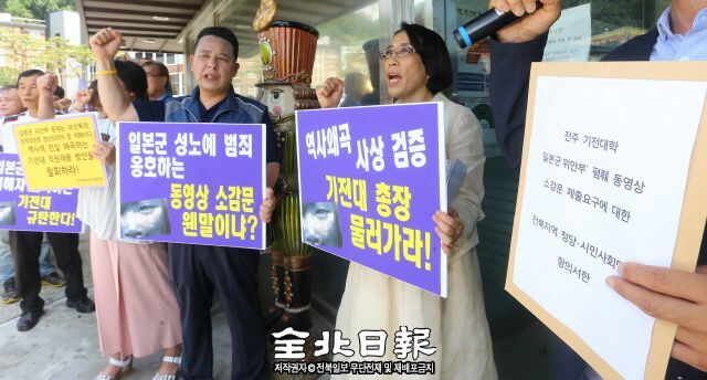도내 시민사회단체들이 27일 전주기전대학교 앞에서 기자회견을 열고 교직원 채용 과정에서 일본군 위안부를 공창으로 표현한 동영상의 소감문 제출을 요구한 기전대학을 규탄하고 총장 퇴진을 촉구했다.