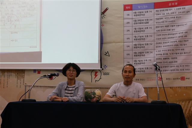 ▲ 지난 27일 최명희문학관에서 열린 전라북도 잡학다식 인문강좌에서 이근수(오른쪽), 신보름 화가가 자신들의 작업세계를 이야기하고 있다.