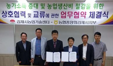 김제시 농업기술센터(소장 유춘기)는 농협중앙회 김제시지부(지부장 전영길)와 지난 28일 농업기술센터 상록관에서 연구개발 기술 공유 및 농가소득 증대 등을 골자로 한 상호협력 및 교류에 관한 업무협약을 체결했다.