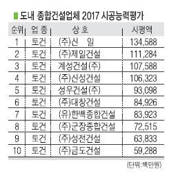 도내 소재 종합건설업체(653개사)의 2017년도 시공능력평가 결과 전년 2위였던 (주)신일이 1346억원을 기록하며 1위에 올랐고 전년 4위였던 (주)제일건설이 1113억원으로 2위, 전년 7위였던 계성건설(주)이 1075억8800만원으로 3위를 기록한 가운데 전년도 13위였던 (주)성전건설이 9위로 새롭게 ‘TOP 10위권’으로 진입했다.