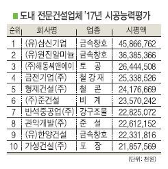 2017년도 도내 전문건설업체 중 시공능력평가액 1위는 전년 2위였던 (유)삼신기업(금속구조물창호공사업:458억6676만2000원)이 차지했다.