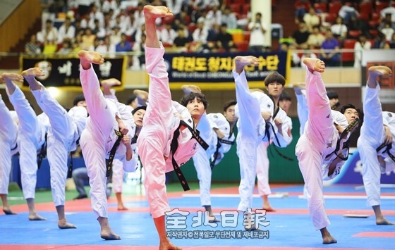 제15회 우석대학교 총장기 태권도대회 개막식이 열린 지난 28일 우석대학교 체육관에서 우석대 태권도학과 학생들의 개막공연이 펼쳐지고 있다.