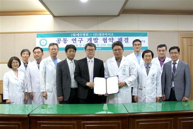 ▲ 예수병원은 (주)엘큐바이오와 공동으로 난치성 피부질환 치료제를 개발하고 있다. 권창영 예수병원 병원장과 서원호 엘큐바이오 대표 등이 참석해 열린 협약식.
