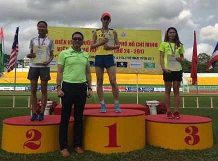 ▲ 지난달 27~ 28일 베트남 호치민시에서 열린 제24회 베트남 호치민시 육상선수권대회에 참가한 익산시청 육상부 신소망 선수가 시상식에서 금메달을 손에 쥔 채로 웃음짓고 있다. 사진제공 = 익산시