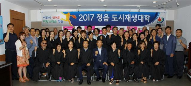 정읍역과 정읍터미널 일원 연지동 활성화에 지역주민들의 참여를 유도하기 위한 도시재생대학(1단계) 기본과정 수료식이 지난달 27일 연지동주민센터에서 열렸다.
