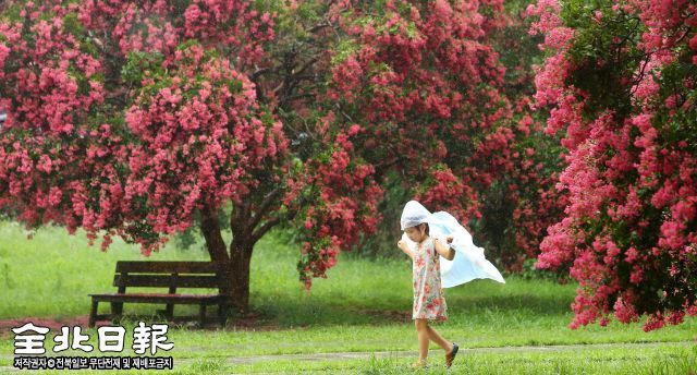 전국 대부분 지역에 장맛비가 내린 지난 31일 전주 향교에서 만개한 배롱나무꽃 사이로 우비를 쓴 어린이가 걷고 있다.