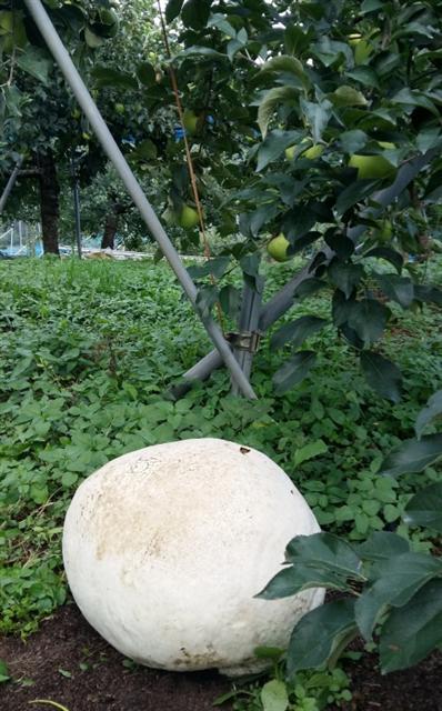 지난 31일 남원 산내면 입석마을 주지환씨의 사과 농장에서 발견된 댕구알 버섯.