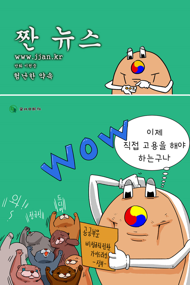 (정부에서 발표한 ‘공공부문 비정규직 전환’ 가이드라인을 들고 있는 신명이와 환호하는 수달들)