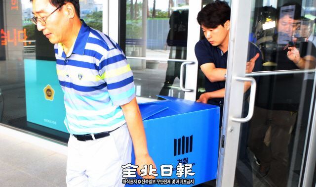 ▲ 7일 전주지방검찰청이 도내 광역·기초의원들의 재량사업비 비리 의혹과 관련해 도의회의 한 의원실을 압수수색한 가운데 수사관들이 압수물품을 옮기고 있다. 박형민 기자