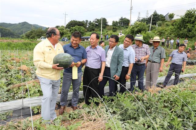 ▲ 지난 8일 황정수 무주군수가 안성면 진도리 흑미수박 출하현장을 방문해 농가 관계자들과 이야기를 나누고 있다.