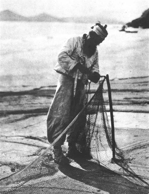▲ 조선시대 한 어민이 낚싯줄을 손보고 있다. 사진제공=군산근대역사박물관