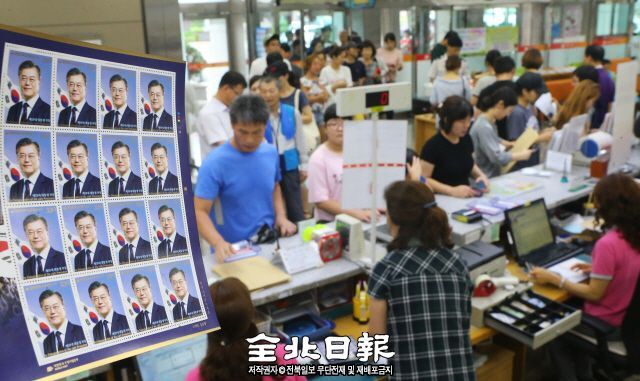 17일 전북지방우정청에 따르면 이날 오전 9시 전북지역 우체국에서 발행된 ‘문재인 우표’가 하루 만에 모두 소진됐다. 전북은 기념 우표 14만4800장, 소형시트 1만4000장, 기념우표첩 550부가 배정됐다.