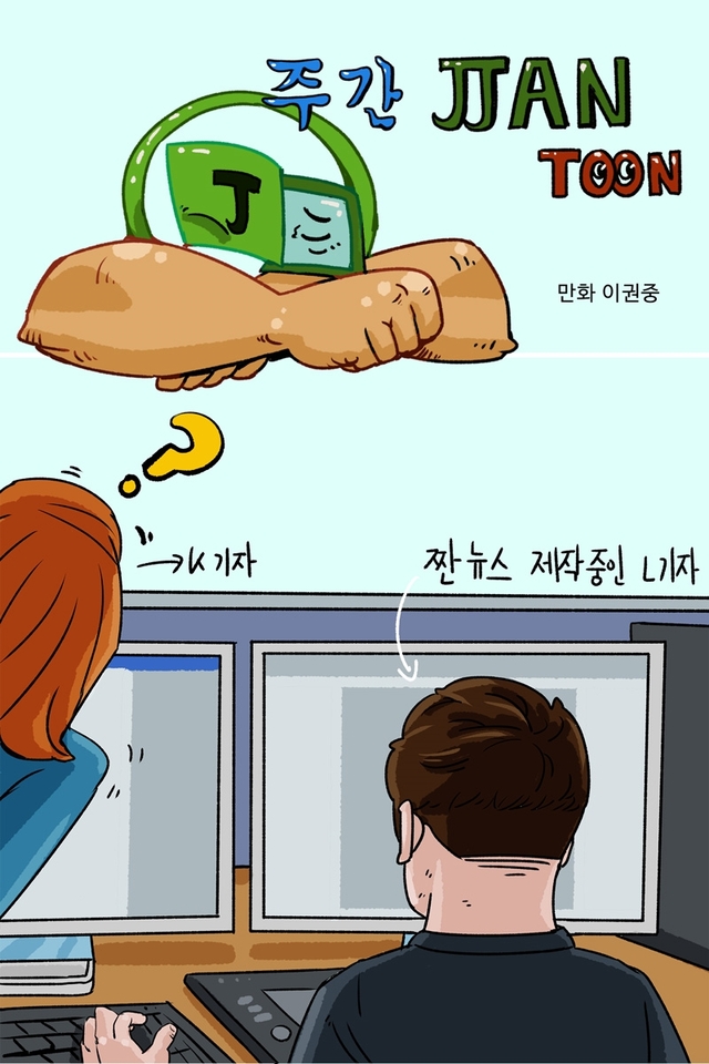 (짠 뉴스를 제작 중인 L기자. 그런 L기자를 K기자가 어깨너머로 보고 있다.)