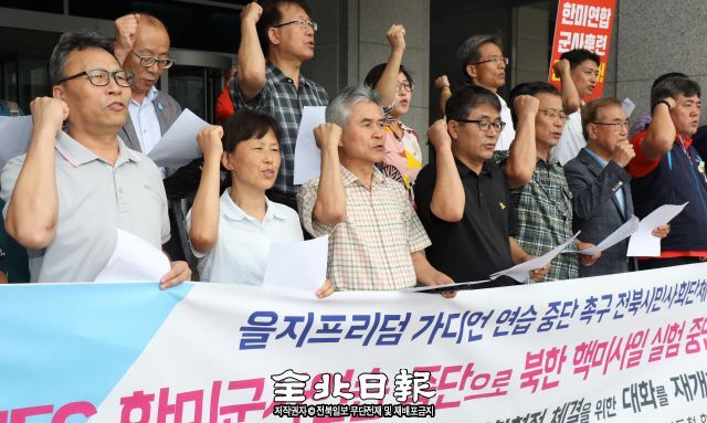 사드한국배치반대 전북대책위원회는 한미 연합 군사훈련인 을지프리덤가디언(UFG)이 시작된 21일 전북도청 앞에서 기자회견을 열고 “한미군사연습 중단으로 북한 핵미사일 실험 중단을 이끌어내야 한다”고 밝혔다.
