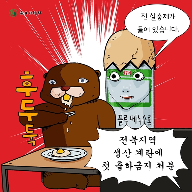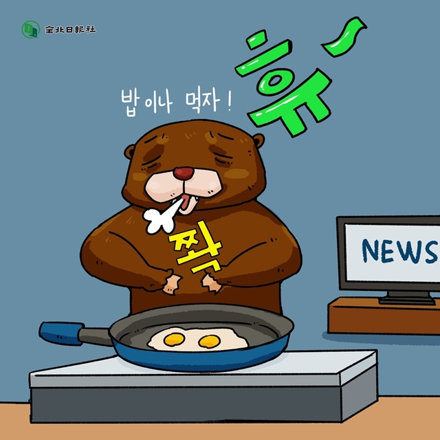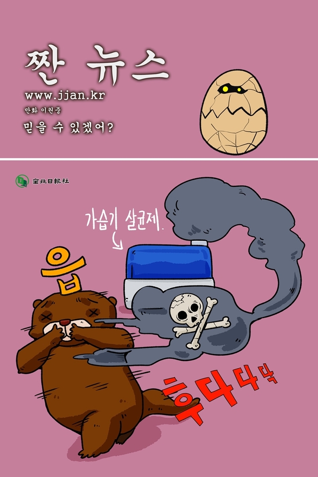 (뉴스에서는 ‘전북지역 생산 계란에 첫 출하금지 처분’ 소식이 나오고 있고, 수달은 믿을 수 없다는 표정으로 달걀후라이를 뱉어내고 있다.)