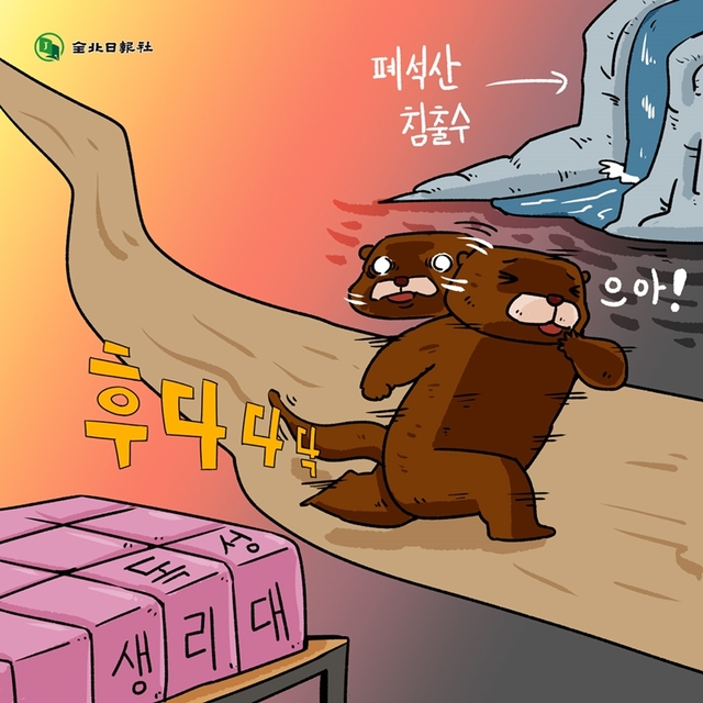 (달아나는 도중에도 독성물질 검출 생리대와 폐석산 불법 매립 폐기물 침출수를 피해야 하는 수달.)