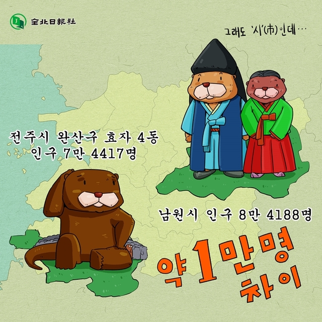전주시 완산구 효자 4동 인구 7만 4417명. 남원시 인구 8만 4188명.