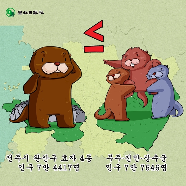전주시 완산구 효자 4동 인구 7만 4417명. 무주·진안·장수군 인구 7만 7646명.