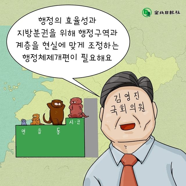 김영진 더불어민주당 국회의원 “행정의 효율성과 지방분권을 위해 행정구역과 계층을 현실에 맞게 조정하는 행정체제개편이 필요해요.”