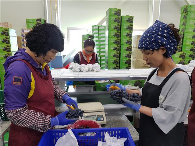 ▲ 지리산농협 농산물 산지유통센터에서 베트남에 수출할 지리산 고랭지 포도를 선별하고 있다.