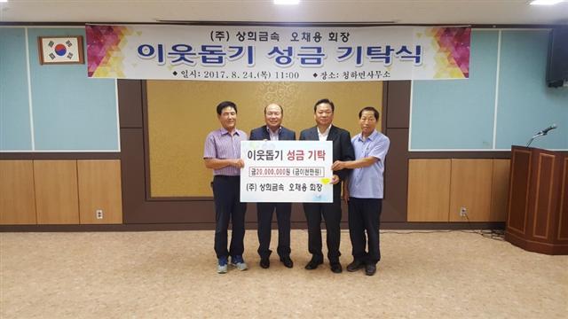 김제시 청하면 출신인 오채용 (주)상희금속 대표가 24일 고향인 청하면에 고향발전을 위해 써 달라며 2000만원을 기탁했다.