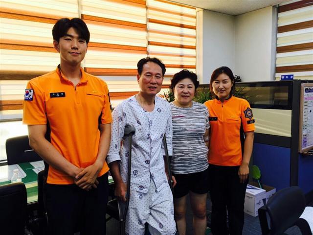 ▲ 김제소방서 이승연(맨 오른쪽)·김범재(맨 왼쪽) 대원의 헌신적인 도움으로 다리 절단 위기에서 벗어난 이형남씨가 소방서를 찾아 감사 인사를 건넸다.