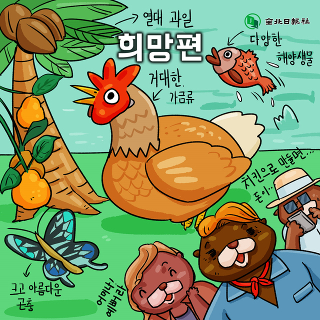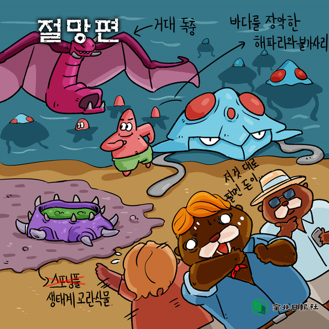 (바다에는 해파리와 불가사리들이 잠식했고 육지에는 거대 독충과 생태계 교란종 식물들이 가득하다. 기겁하는 박사 수달들.)