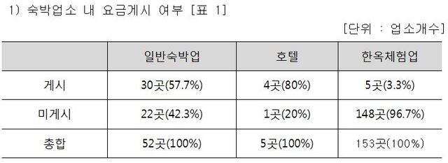 조사결과 모텔 등 일반숙박업소 52곳 중 22곳(42.3%), 호텔 5곳 중 1곳(20%)이 요금표를 게시하지 않았다.